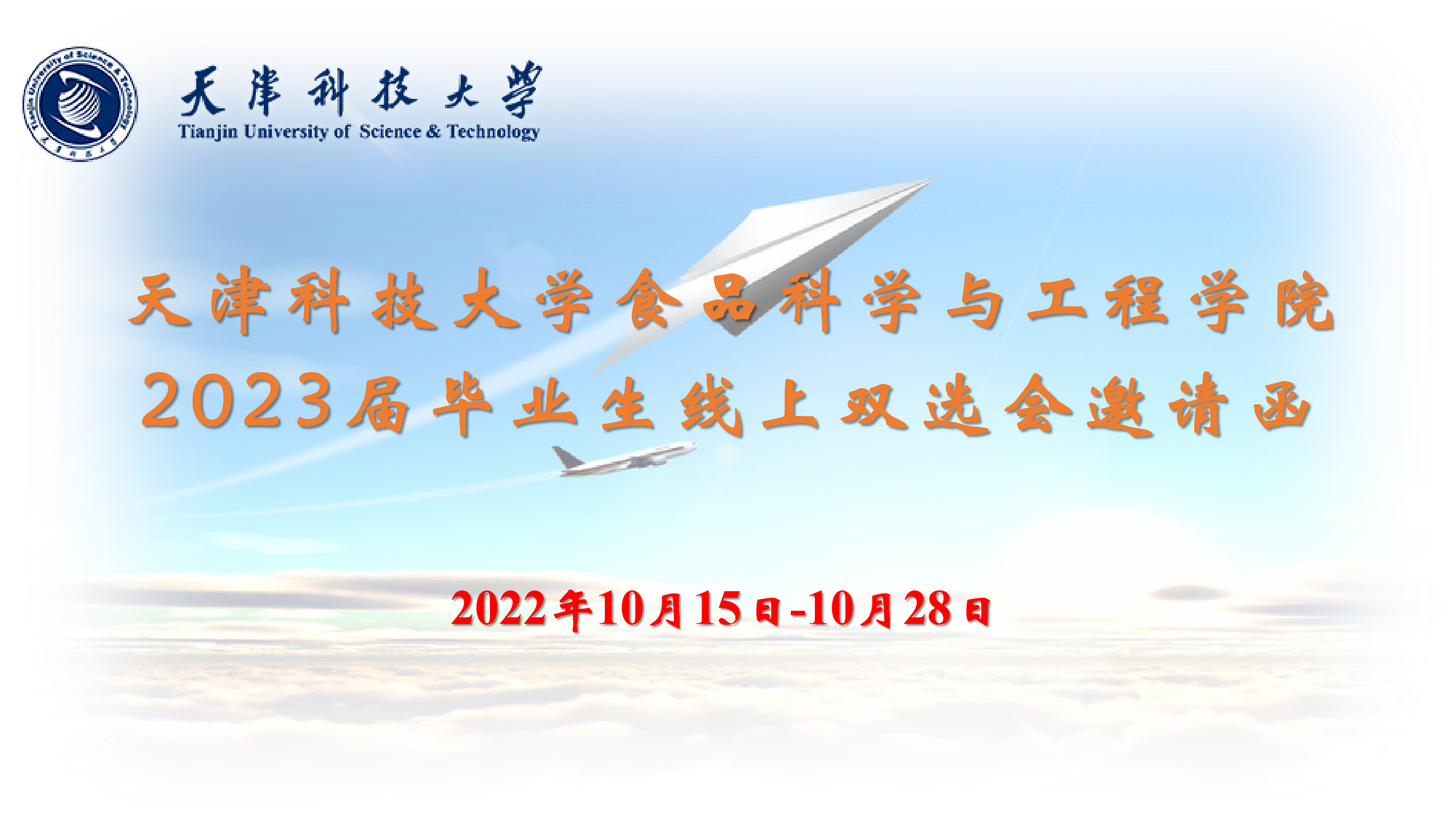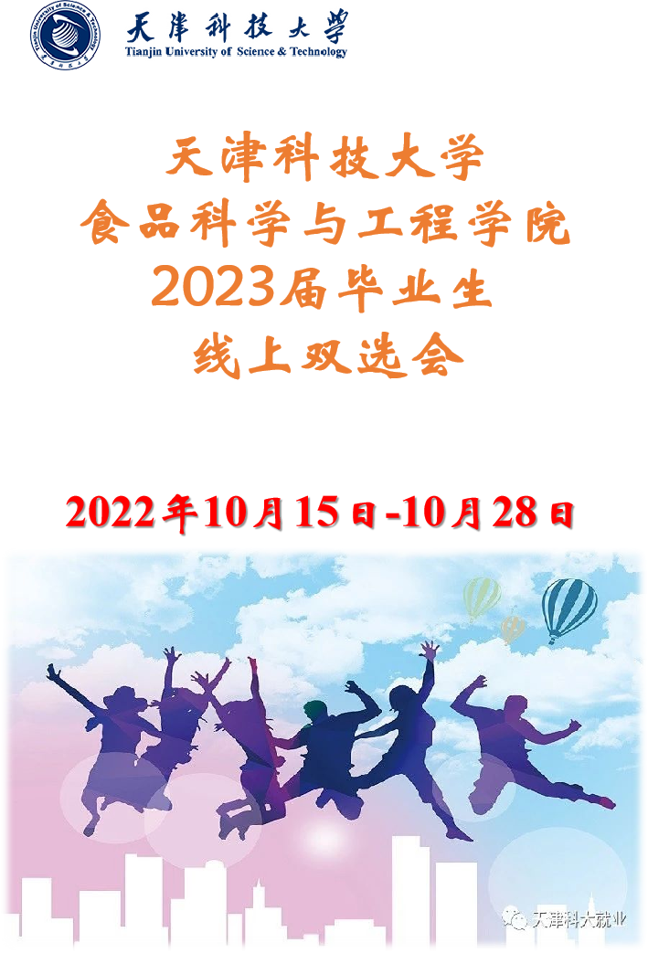 衷心感谢您对天津科技大学食品科学与工程学院2023届毕业生就业工作的大力支持!当前正值2022年秋季招聘黄金期,我院学生正在积极求职过程中,为搭建毕业生与用人单位双向交流平台,深化院企长期合作关系,拟定于2022年10月15日至10月28日举办食品科学与工程学院2023届毕业生线上双选会,诚挚邀请全国用人单位参加,具体如下: