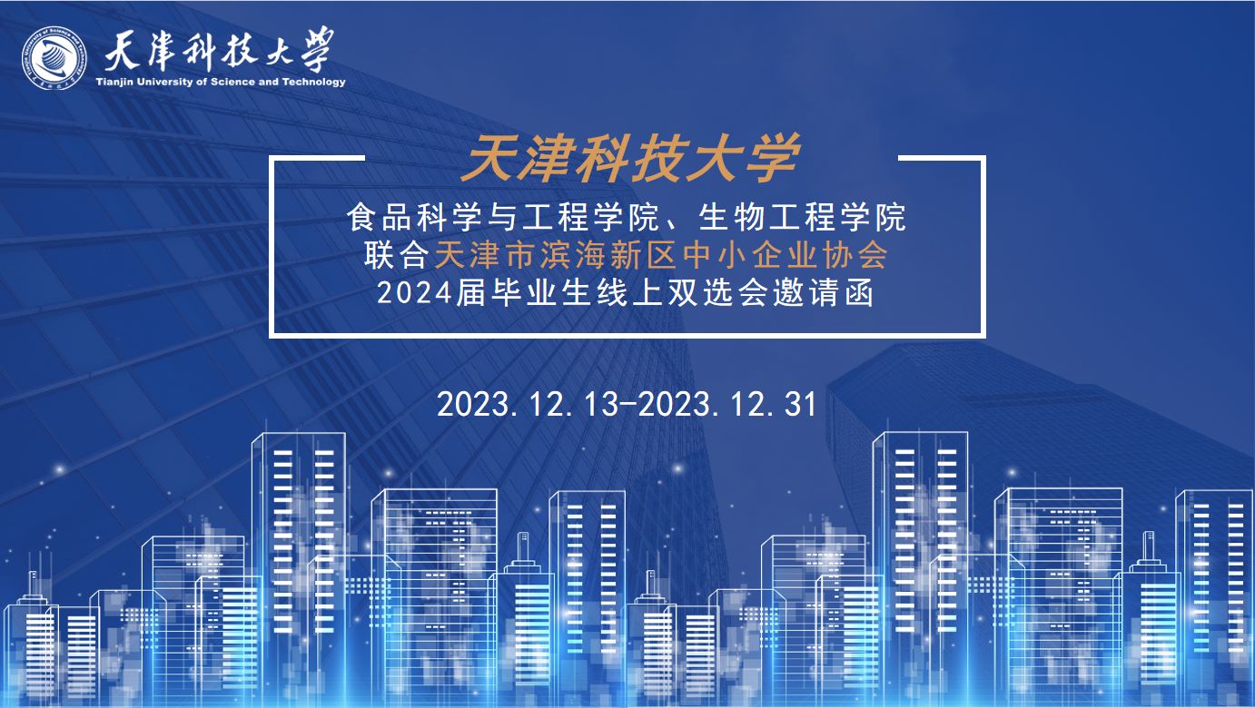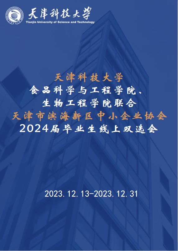 您好!衷心感谢贵单位对天津科技大学食品科学与工程学院、生物工程学院2024届毕业生就业工作的关注和支持!当前正值2024届毕业生求职择业的关键时期,为搭建企业与毕业生双向选才平台,促进校企合作,实现优势互补,食品、生物学院将联合天津市滨海新区中小企业协会于2023年12月13日-12月31日举办2024届毕业生线上双选会。我们诚挚邀请各用人单位单位参与,帮助毕业生实现充分就业、高质量就业,具体事宜如下: